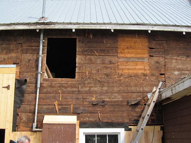 On the weekend Saturday of May 19 and 26, 2012 we re-shingled the front of the barn and painted it in the fall of that year. We painted the new shingles on September 8, 2012.